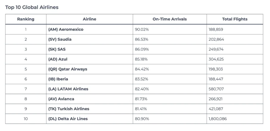Durante el periodo analizado, Aeroméxico operó 188,859 vuelos en 23 países, manteniendo un nivel de confiabilidad operativa que la colocó por encima de competidores relevantes a nivel internacional. En el ranking global, Saudia ocupó el segundo lugar con 86.53% de puntualidad, mientras que SAS se ubicó en la tercera posición con 86.09%.