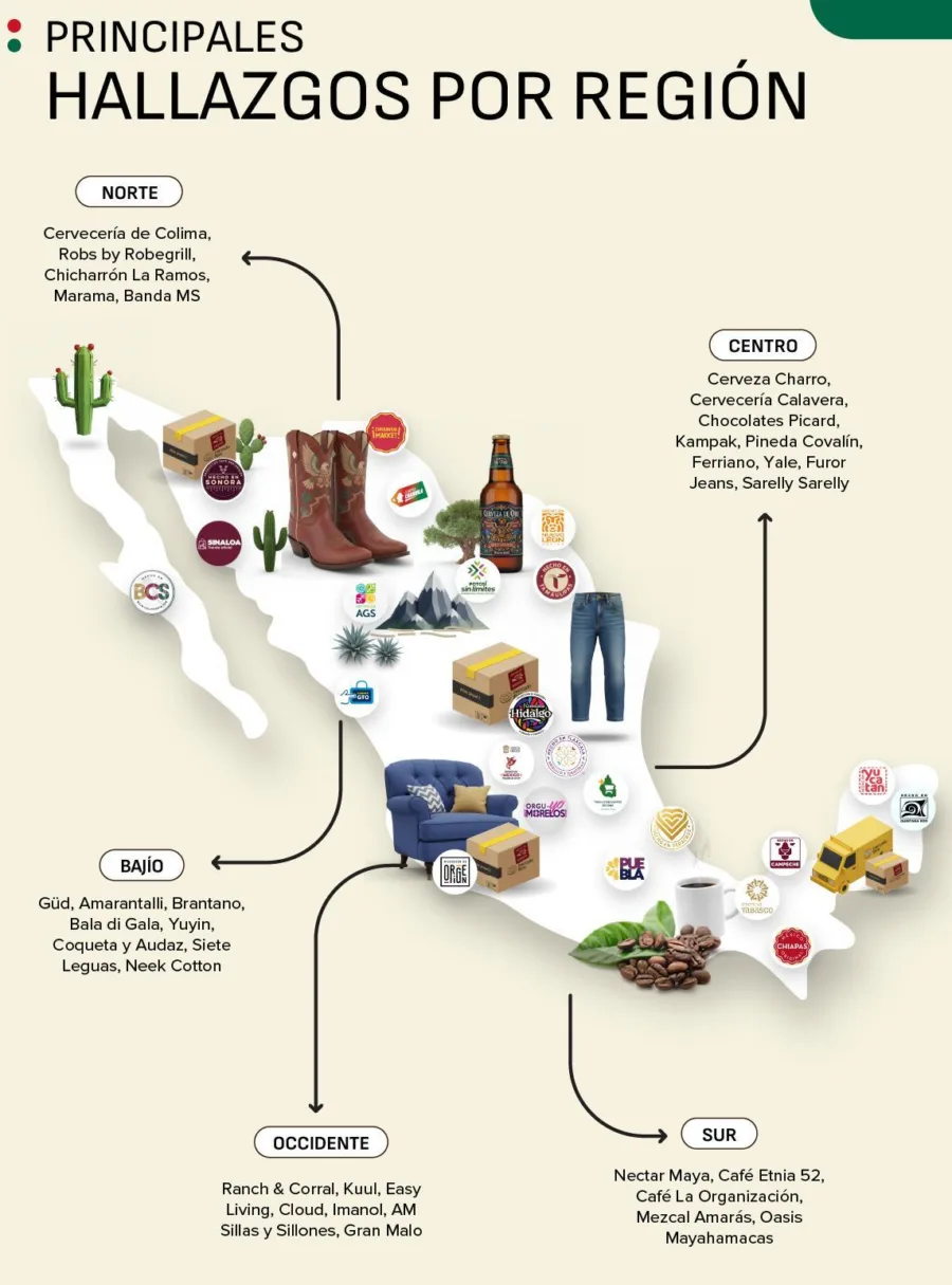 Asimismo, Mercado Libre destacó a través de un mapa marcas emblemáticas de cada región de la República Mexicana que participan en su plataforma, como Chocolates Picard en el centro, Chicharrón La Ramos en el norte, Neek Cotton en el Bajío, Gran Malo en el Occidente o Néctar Maya en el sur.