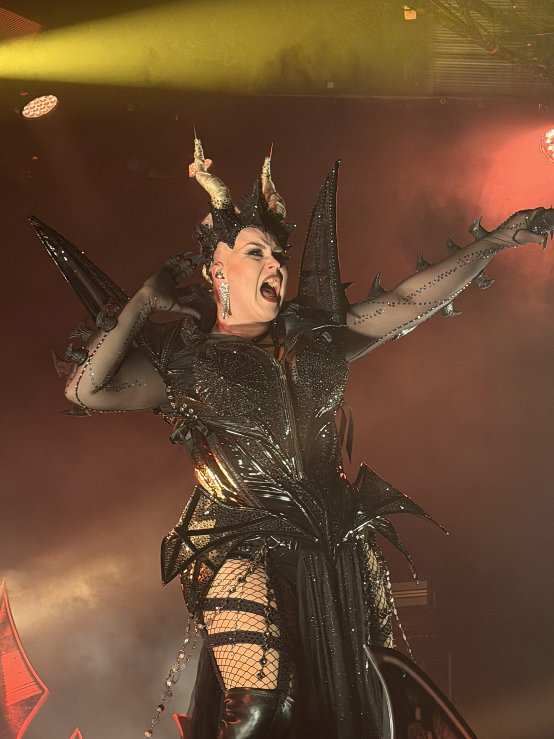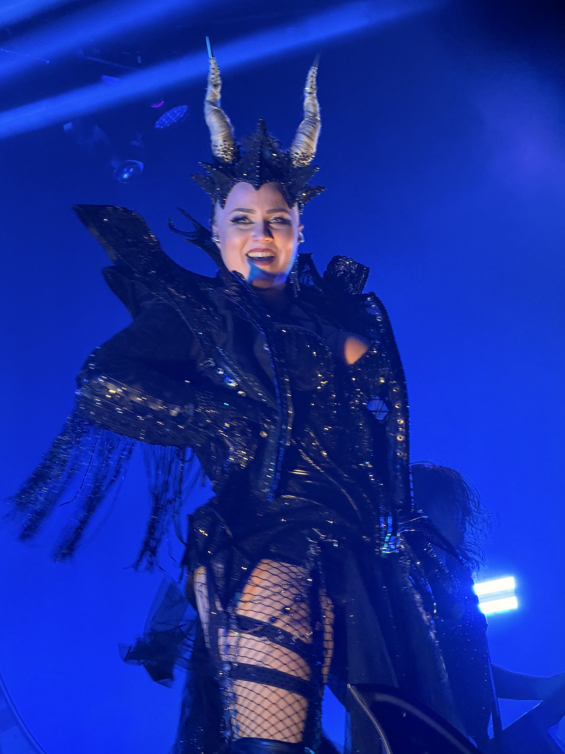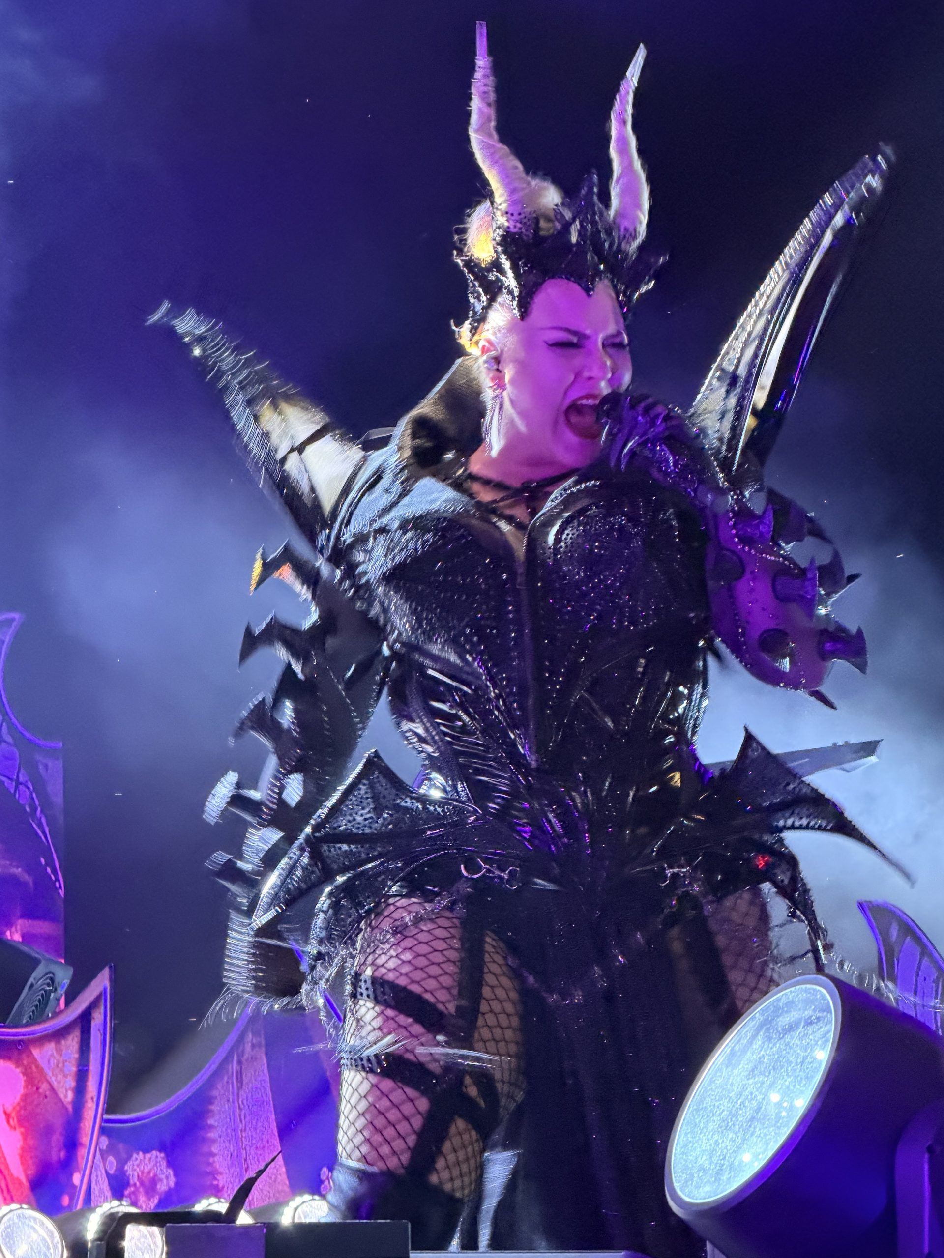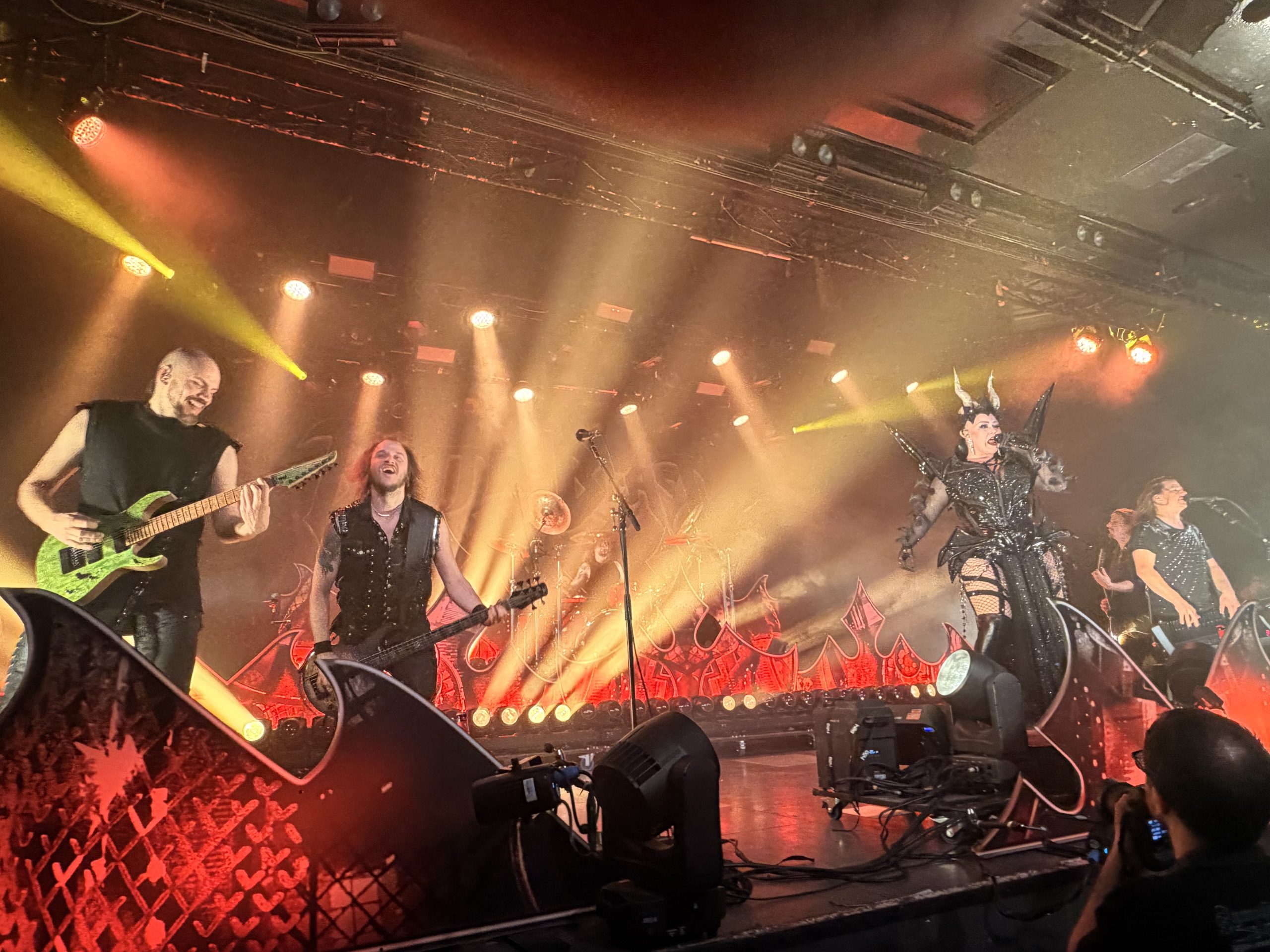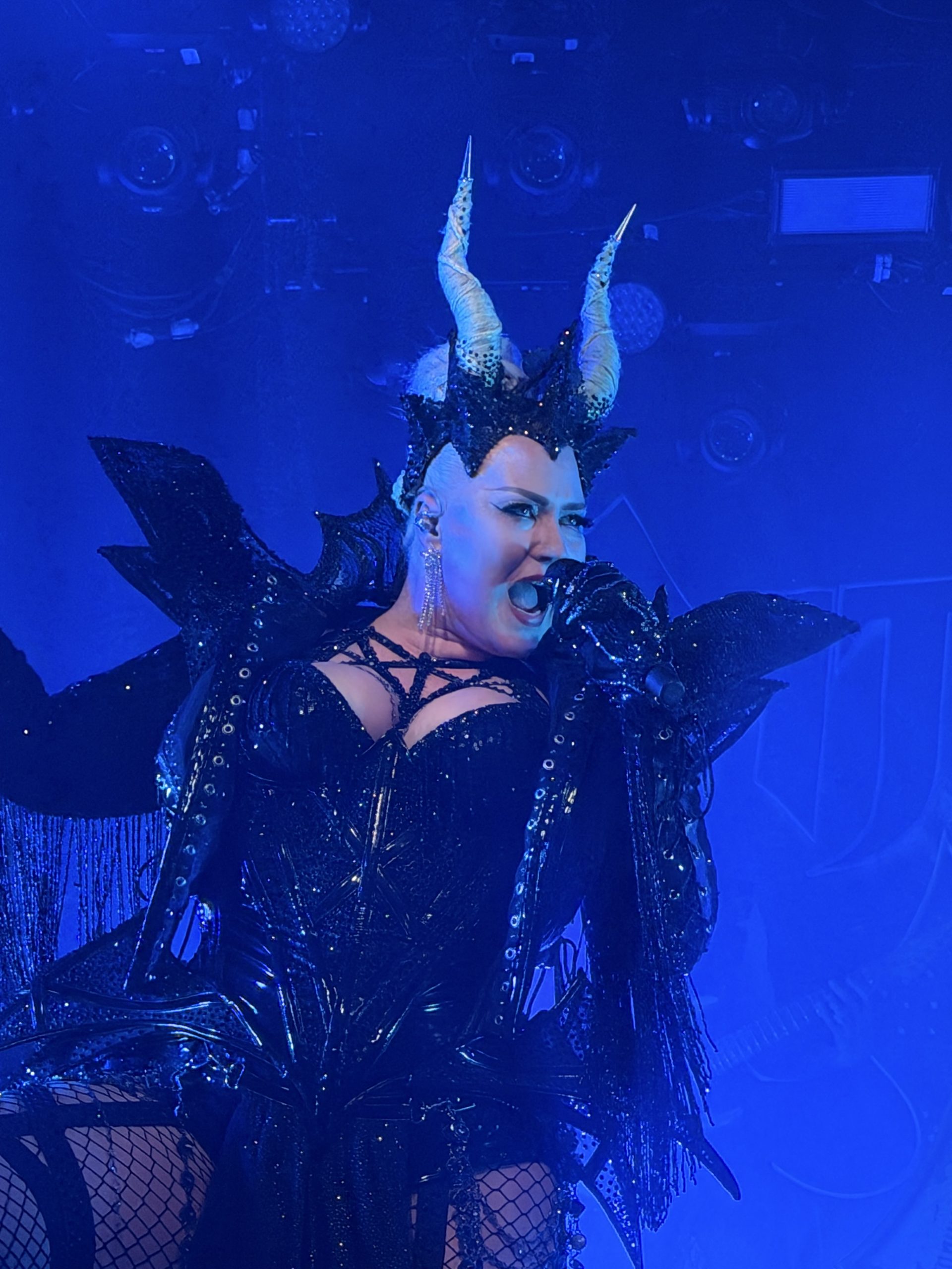 A las 21:00 horas comenzaba la introducción de “The Long Road” para que apareciera Pyry detrás de su batería golpeando el bombo mientras iban tomando posiciones en el escenario cada uno de los miembros siendo el arranque de la batalla de las bestias con “Straight to the Heart” y la presencia escénica absoluta de Noora Louhimo ataviada con su outfit característico para la ocasión, cornamenta incluida, y su potente e inconfundible voz poniéndonos la piel de gallina desde el minuto cero a todos los allí presentes, pasando sin descanso a “Master of Ilusion” con Noora animando a cantar a todo el público, con una pausa para saludar y preguntar si estábamos emocionados y listos para lo que nos venía encima con el adelanto de su nueva obra “Last Goodbye” para que Noora se engalanase con sus gafas de sol rollo Elton John, demostrando su potencial y su valía pasando a su tercer sencillo con la presentación de “Here We Are”.