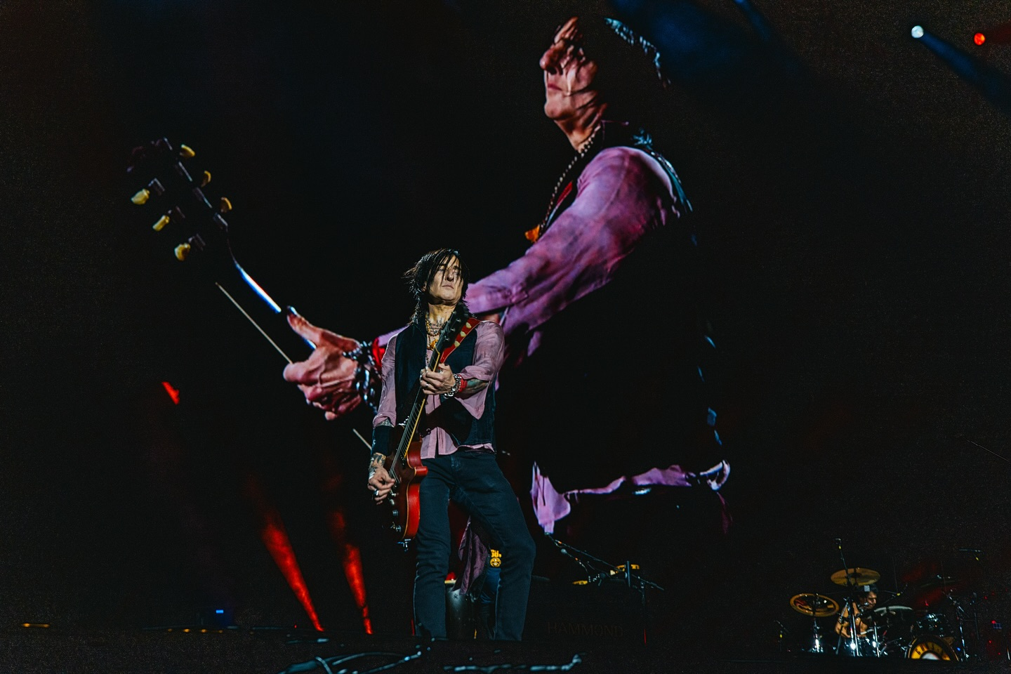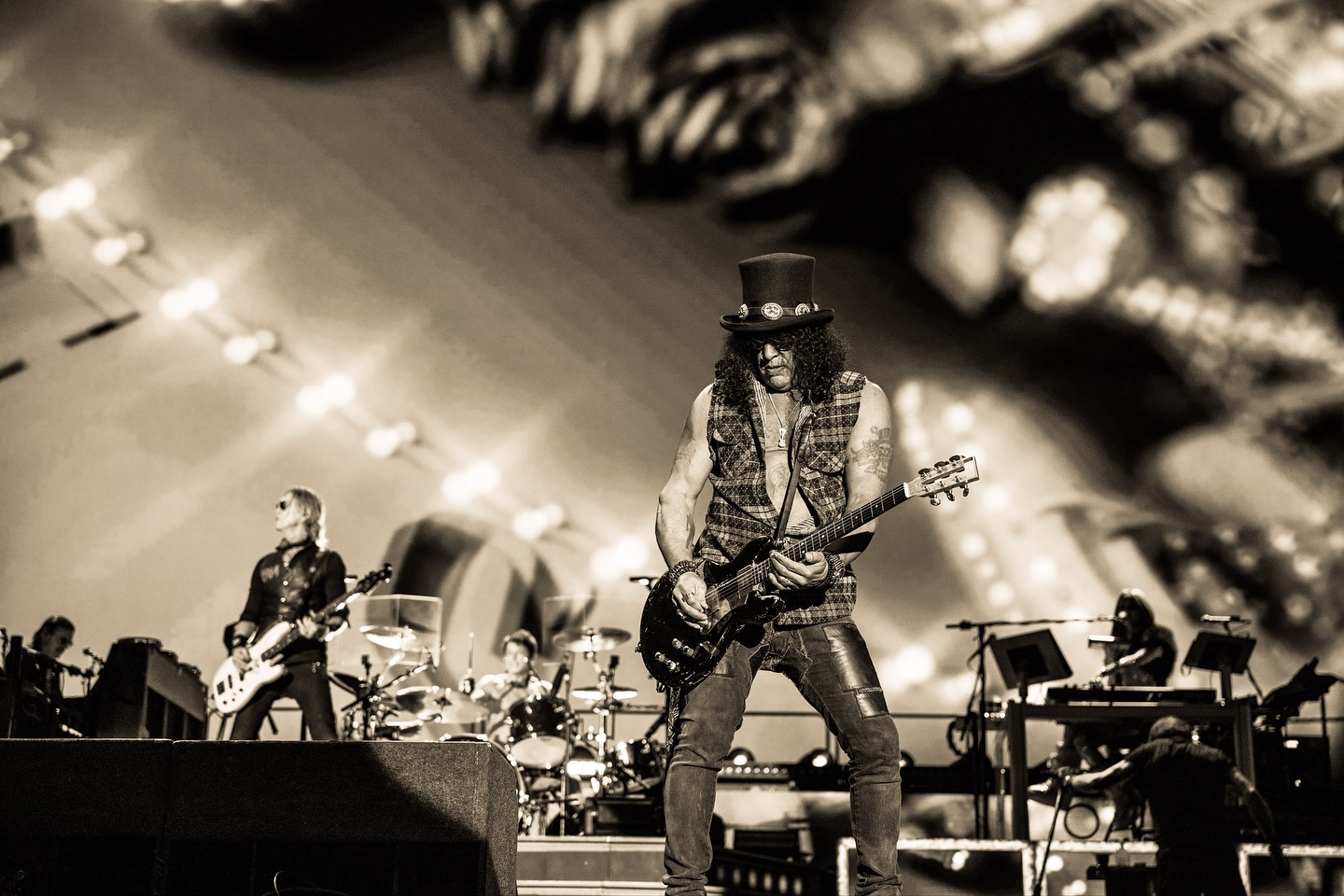 Slash y Duff McKagan, pilares desde el principio, dirigieron la instrumentación con maestría, tejiendo la noche en un tapiz de solos incendiarios y ritmos que no dan tregua. Duff tomó el mic para un tema, y Slash desató «Hide Away» de Freddie King, un blues crudo que deleitó a los aficionados al género y subrayó las raíces sureñas que GNR siempre ha reivindicado más allá del glam metal.