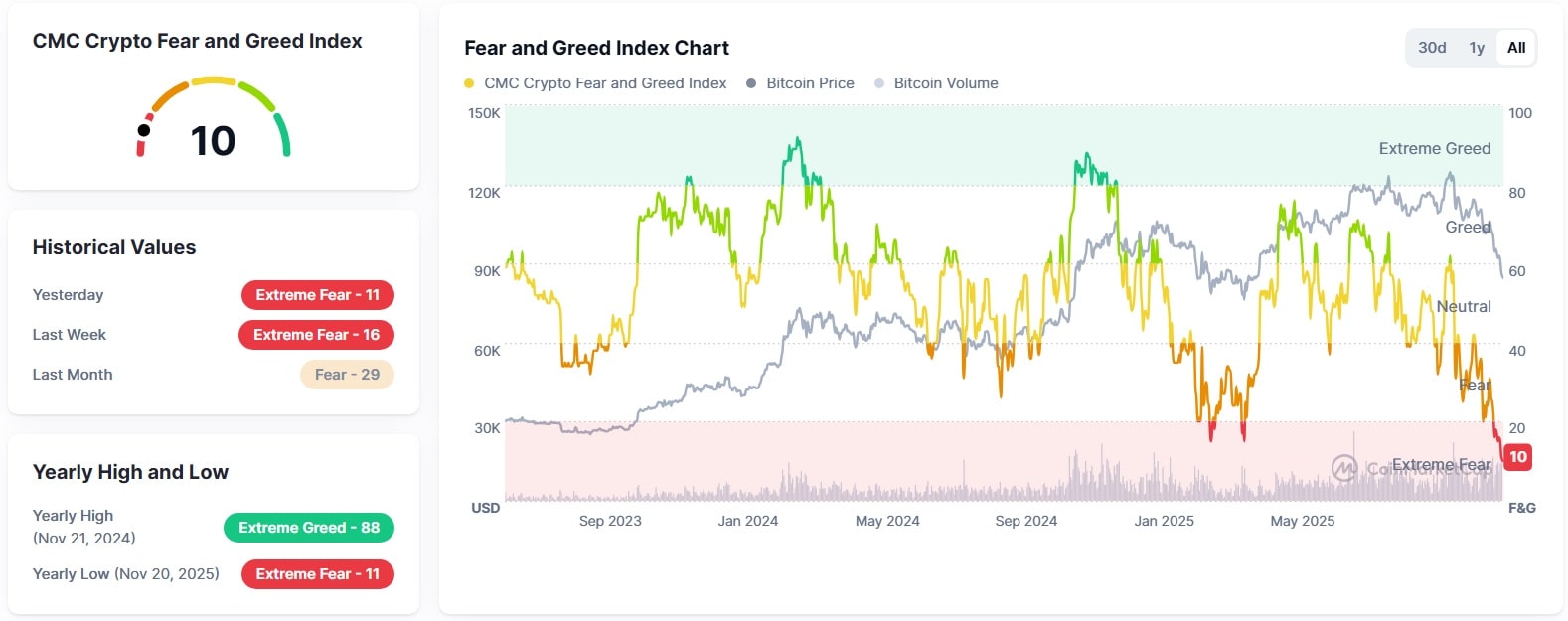 El gráfico del Índice de Miedo y Avaricia (Fear & Greed Index) de CoinMarketCap indica que el sentimiento actual del mercado de criptomonedas se encuentra en un estado de «miedo extremo», en un nivel de 10 en una escala de 0 a 100. Este es el nivel más bajo que ha tocado el índice durante los últimos dos años.