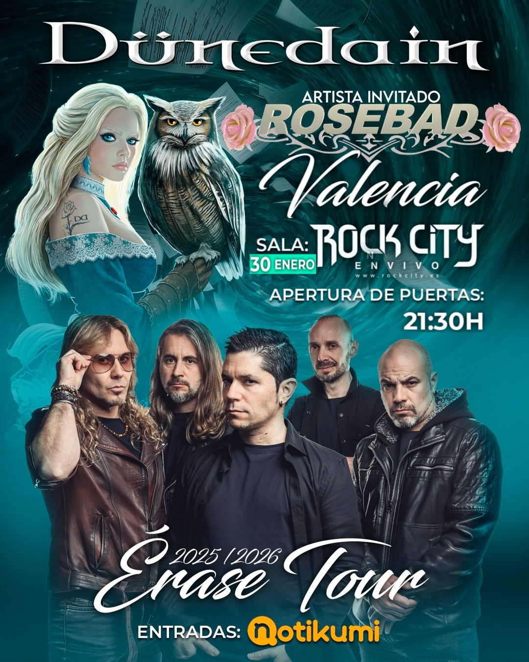Liderados por Tony Delgado, la banda española de heavy metal DÜNEDAIN lleva desde 2007 haciendo un heavy metal potente, cargado de grandes melodías y guiños pop. En 2009 consiguieron un sonido característico que les ha consagrado como maestros del heavy metal melódico. “Mágica”, en 2012, supuso su salto a los grandes escenarios así como la nominación a mejor disco independiente de metal. “Pandemonium” (2016), se caracteriza por su propuesta de gran calidad compositiva y virtuosismo vocal. Su exitosa gira de presentación ha recorrido más de 20 fechas, con varios sold out y un rotundo lleno en su primer Circo Volador de Ciudad de México. En 2019, publican “Memento Mori”, lanzamiento que les permite hacer giras en Latinoamérica y consolidarse en lo más alto de la escena española. El viernes día 30 tendrás la oportunidad de disfrutar de su primer concierto de este año presentando su última entrega con ROSEBAND como grupo invitado, a partir de las 21:30 h. en la Sala Rock City de Valencia. Entradas disponibles pinchando en la imagen.