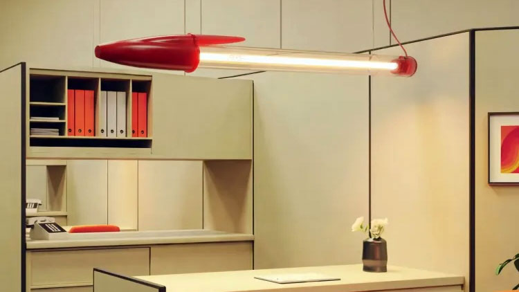 Disponible en breve en azul, negro y rojo –no sabemos por qué no en verde– la lámpara está a escala 12:1, lo que le da unas medidas de 180 centímetros de largo por 10 de ancho.