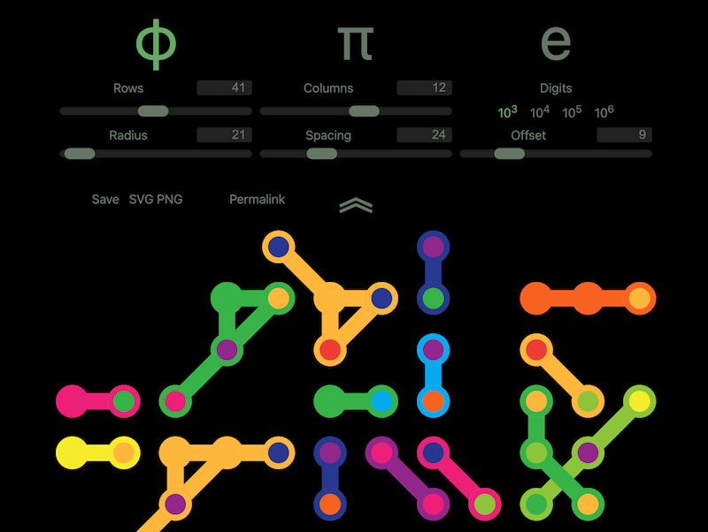 La página permite interactuar con los datos: se puede elegir el número representado (π, Φ o e), ajustar el número de filas y columnas, modificar el radio de los círculos y el espacio entre ellos, así como activar o desactivar las líneas que conectan las cifras.