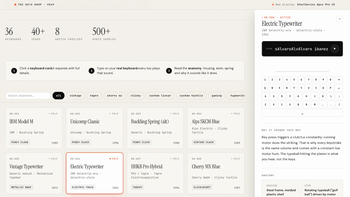 El contenido está perfectamente documentado y en total reúne 36 teclados y familias de teclas/interruptores a lo largo de más de 40 años (y alguno de más allá), con más de 500 muestras de audio para comparar cómo sonaban de verdad o, si quieres, grabar concretamente alguno de ellos.