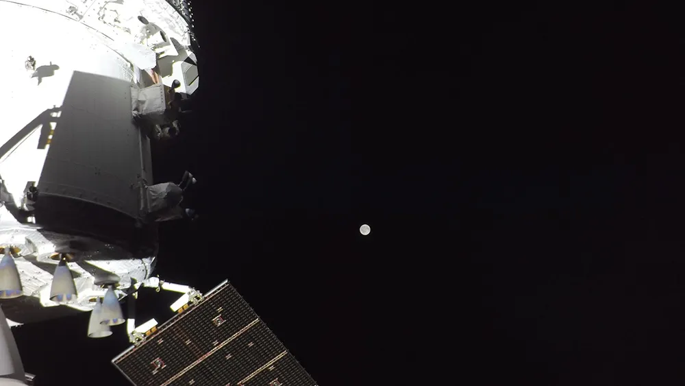 La Luna e Integrity vistas con una de las cámaras que hay en los extremos de los paneles solares del Módulo de servicio Europeo, que sale en primer plano en la foto – ESA