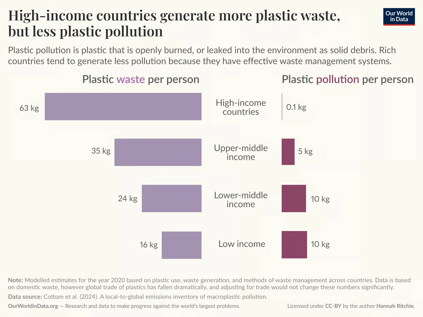 En los países ricos y más desarrollados se generan 63 kg de residuos plásticos por persona al año, pero por cómo se gestiona su reciclaje solo 0,1 kg acaba contaminando. En contraposición, en los países con rentas bajas, medio-bajas y medio-altas se generan de 16 a 35 kg y de 5 a 10 kg de contaminación por persona.