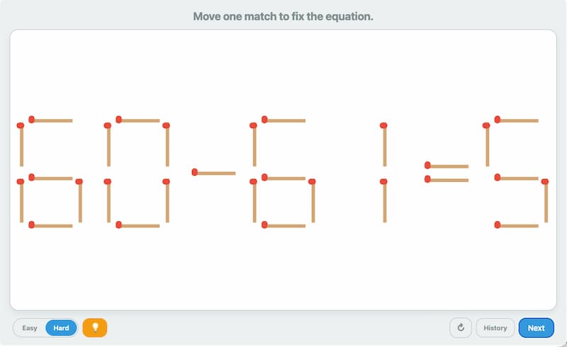 Move One Match consiste en hacer que las ecuaciones sean correctas moviendo una sola cerilla. Es uno de esos entretenimientos matemáticos tradicionales que en tiempos se jugaban con lápiz y papel, o en las comidas y fiestas con cerillas de verdad… Cuando la gente usaba cerillas, claro.