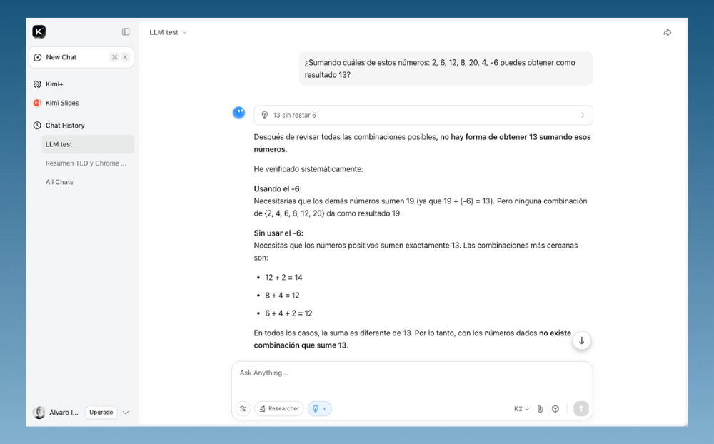 Según sus creadores, lo más destacable de Kimi K2-Thinking son sus capacidades de razonamiento paso a paso y el uso autónomo de herramientas. Puede realizar entre 200 y 300 llamadas secuenciales a herramientas internas sin intervención humana, demostrando una capacidad excepcional para resolver problemas complejos a través de razonamientos largos, algo de lo que otros modelos adolecen. La versión K2-Instruct es más para chats generales sin tanta floritura.