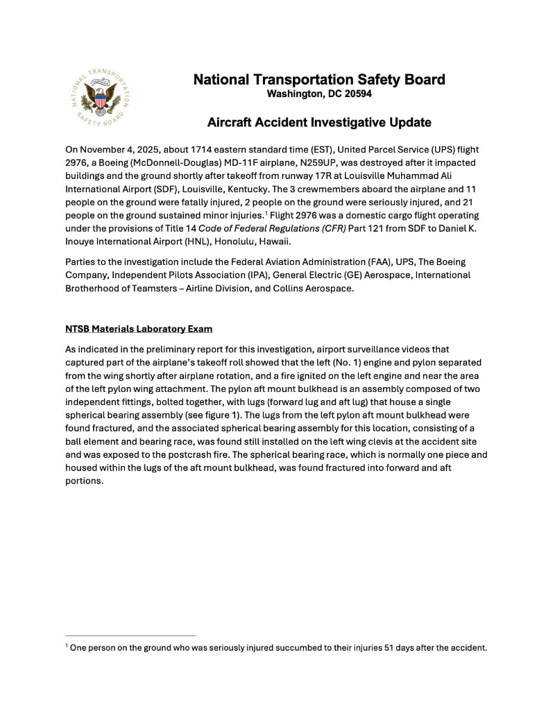 La Junta Nacional de Seguridad en el Transporte (NTSB por sus siglas en inglés) de los Estados Unidos ha publicado una actualización [PDF] de su investigación del accidente del MD-11 de carga de UPS que se estrelló el pasado 5 de noviembre al despegar del aeropuerto de Louisville.