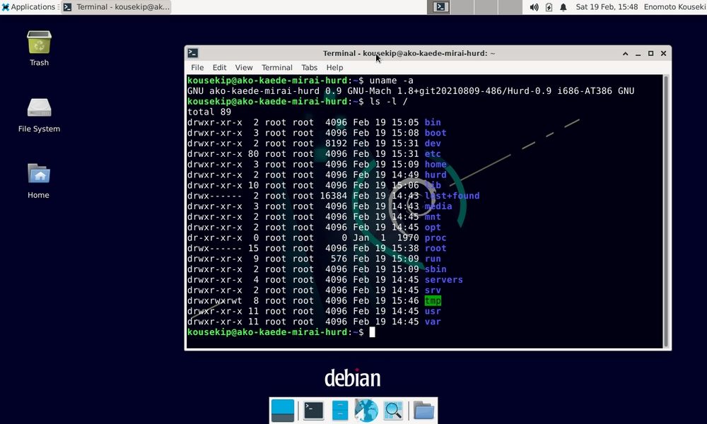 Una sesión de terminal en Debian GNU/Hurd 0.9 demostrando su identidad de sistema. A diferencia de Linux, aquí los servicios se gestionan como procesos independientes. Foto: Wikipedia