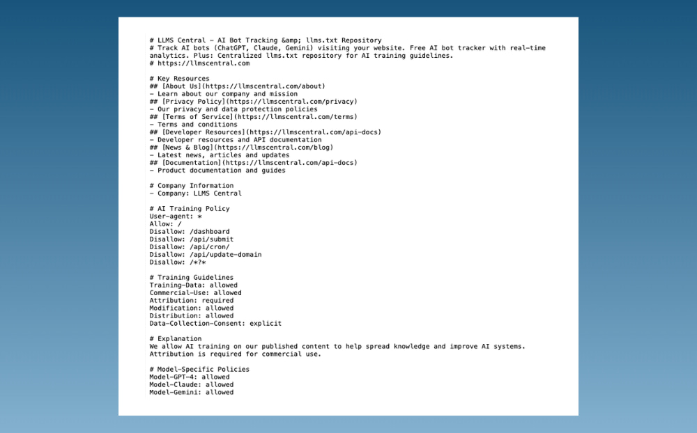 El LLMs.txt es un formato de archivo estandarizado que permite a los propietarios de sitios web comunicar sus políticas de entrenamiento y uso de contenidos a los rastreadores de IA, a los modelos lingüísticos y a los motores de búsqueda basados en IA.