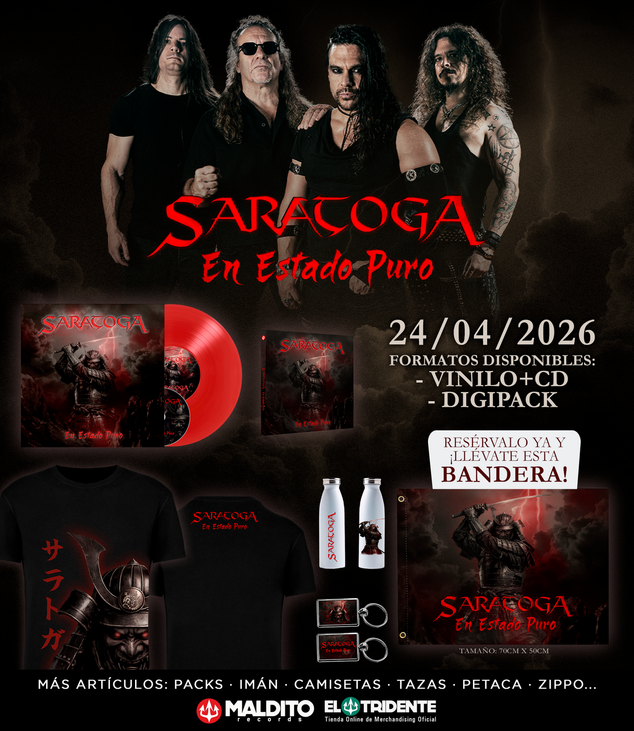 Ya se encuentra disponible la reserva del nuevo disco de SARATOGA, “En Estado Puro”en la tienda online de El Tridente, en formato vinilo rojo que incluye CD y en formato digipack. Reserva antes de la fecha del lanzamiento (24/04) y llévate una bandera exclusiva (70cm x 50cm). Además, puedes encontrar más artículos del nuevo álbum, como camisetas, sudaderas, llaveros y superpacks