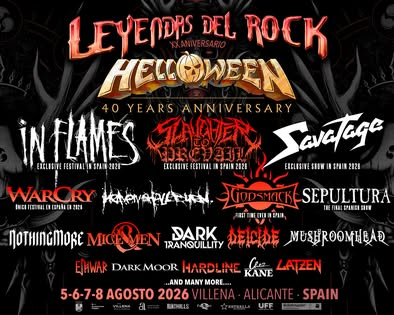 En España, IN FLAMES estarán tocando el dia 5 de Agosto en la sala Totem de Pamplona y el dia 8 en la SalaCustom de Sevilla con Gaerea & Employed To Serve. Ademas el día 7 actuarán en el XX Aniversario del Festival LEYENDAS DEL ROCK que se celebrará del 5 al 8 de Agosto de 2026 en el Polideportivo Municipal de Villena (Alicante). Entradas disponibles pinchando en la imagen.