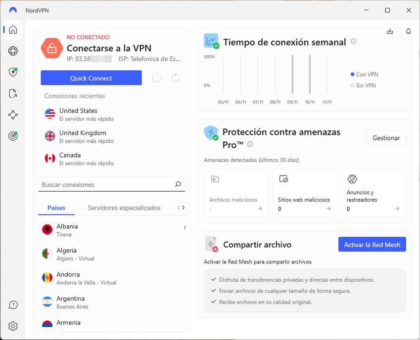 Como ya hemos adelantado, no requiere tener la conexión VPN activada para poder contar con estos escudos de seguridad, por lo que vamos a poder estar protegidos en todo momento, incluso cuando naveguemos en plano sin enviar nuestro tráfico a través de los servidores de NordVPN. Eso sí, aunque esta capa de seguridad nos protege de las amenazas que se esconden en la red, no es un antivirus propiamente dicho, por lo que recomendamos usarlo siempre junto a un software de seguridad convencional, como el propio Microsoft Defender. Así estaremos protegidos al 100% de todos los virus, troyanos, y otras amenazas que puedan llegar a nuestro ordenador.