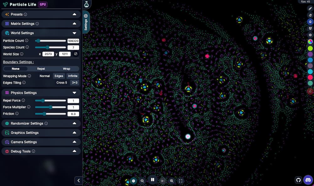 En este curioso universo de partículas las fuerzas básicas dan lugar a estructuras estables, patrones fluidos y transiciones caóticas en tiempo real. Se puede ajustar prácticamente todo: fuerza de repulsión, fricción, modos de borde (normal, infinito o en mosaico), así como los parámetros del pincel para manipular directamente el sistema.