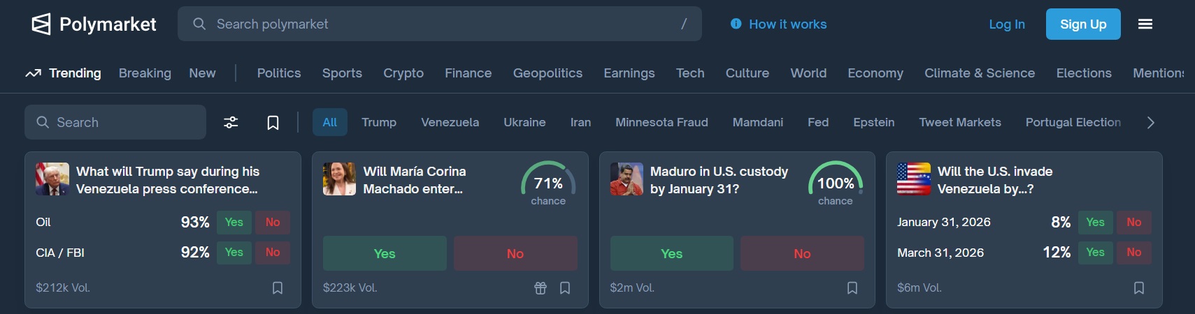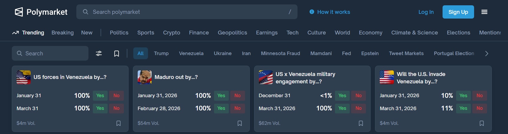 Los mercados predictivos respondieron a los reportes iniciales con un fuerte aumento en el volumen de contratos relacionados con Venezuela. Uno sobre una posible intervención militar superó los USD $60 millones, mientras que otro sobre la salida de Maduro excedió los 54 millones. En total, junto con otros contratos en tendencia vinculados al tema, se apostaron más de USD $125 millones.