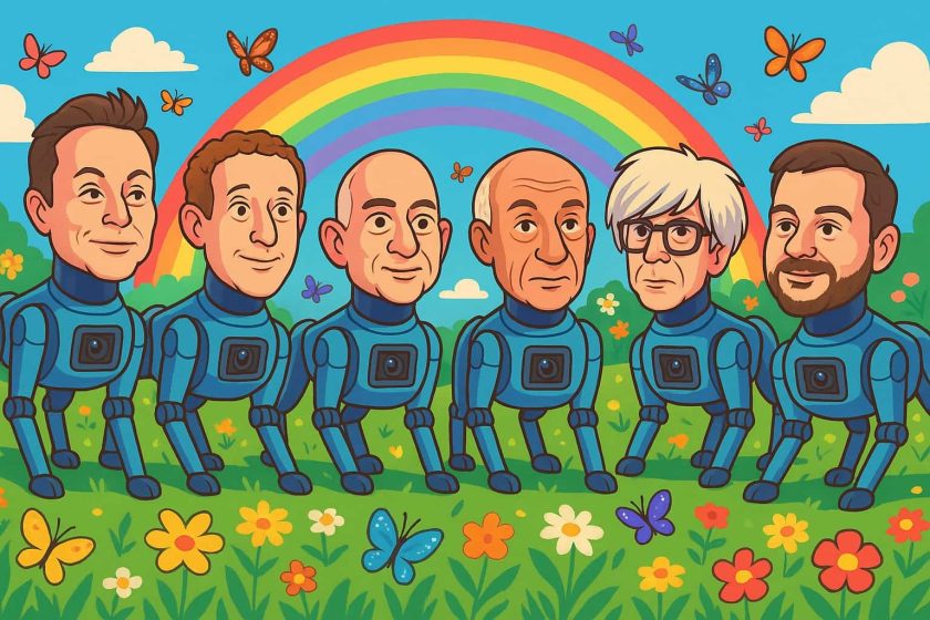 Una serie de robots con caras de multimillonarios como Musk y Zuckerberg.