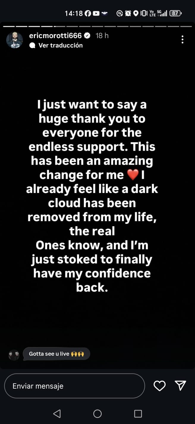 En su nuevo mensaje, Morotti se muestra aliviado y agradecido por el respaldo que ha recibido de sus seguidores, luego de haber hablado sobre el ambiente de toxicidad que enfrentaba en su anterior banda.