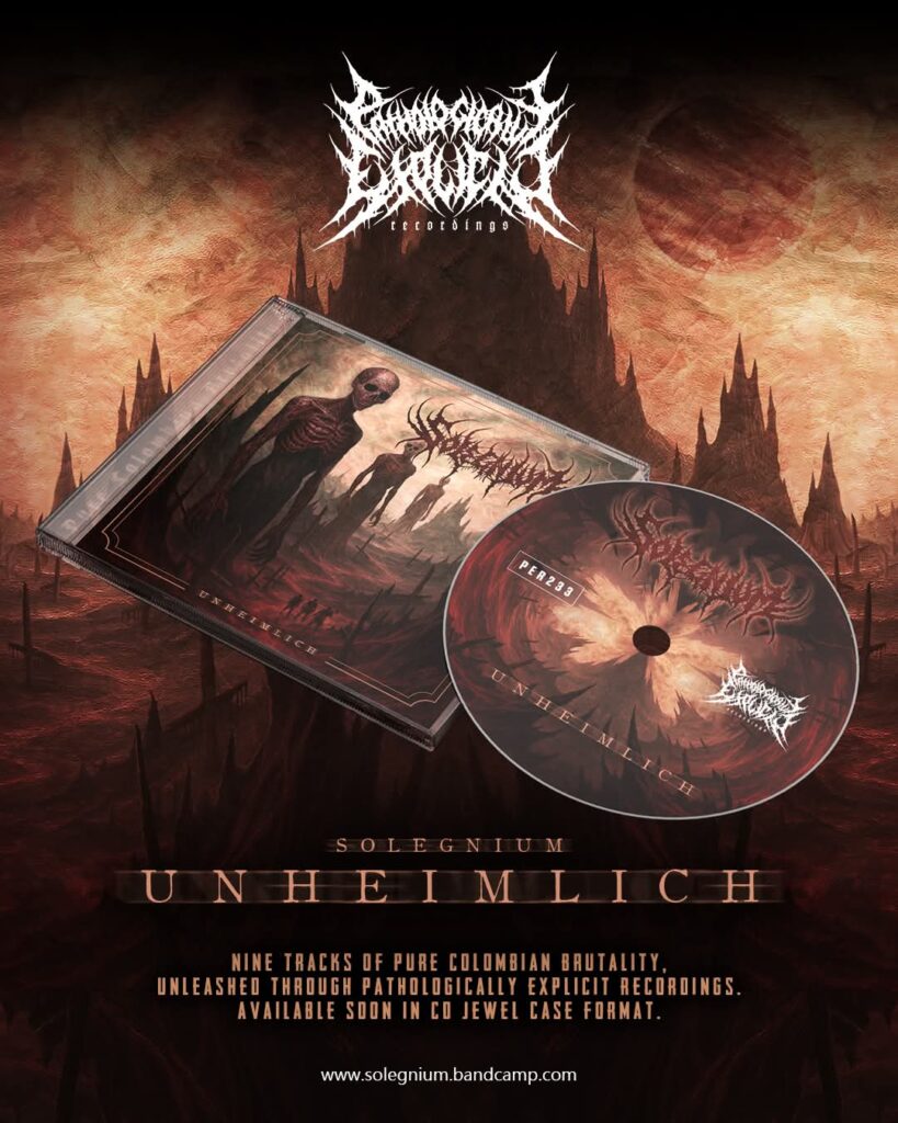 Grabado en SoundTech Studios y producido por Pathologically Explicit Recordings, UNHEIMLICH se erige como el trabajo más maduro y visceral de SOLEGNIUM hasta la fecha: una declaración de absoluta intensidad que honra las raíces del death metal colombiano a la vez que empuja sus límites hacia territorios más oscuros e introspectivos.