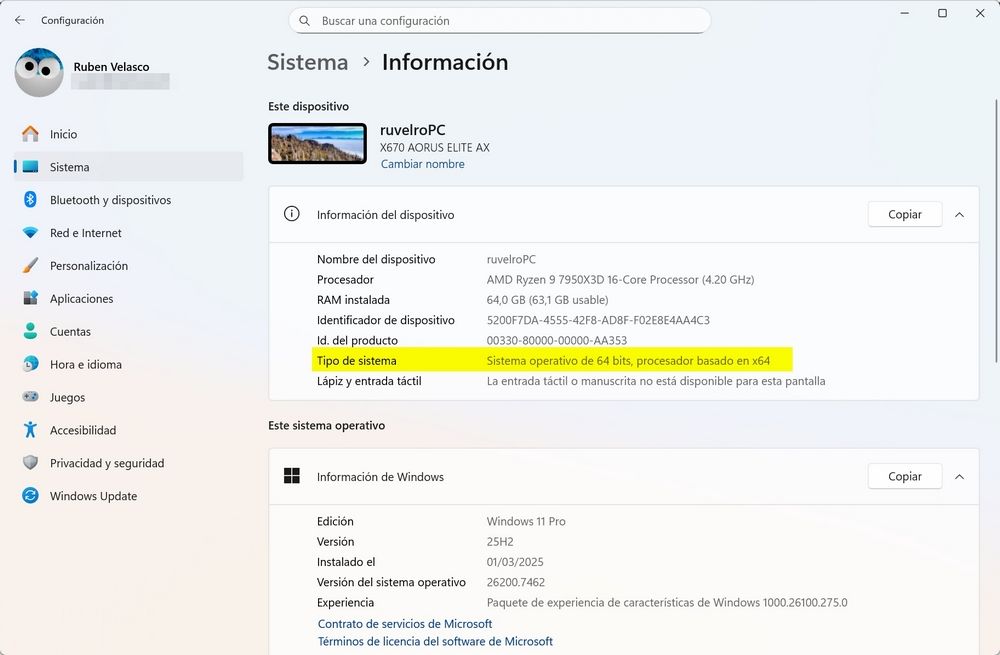 • Sistema operativo de 64 bits, procesador x64 -> Todo correcto. Estamos usando la versión moderna de Windows, compatible con Steam y cualquier software actual.
