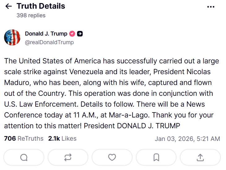 “Los Estados Unidos de América han llevado a cabo con éxito un ataque a gran escala contra Venezuela y su líder, el presidente Nicolás Maduro, quien ha sido capturado junto con su esposa y sacado del país en avión. Esta operación se realizó en conjunto con las fuerzas del orden estadounidenses. Más detalles seguirán. Habrá una conferencia de prensa hoy a las 11 a.m. en Mar-a-Lago. ¡Gracias por su atención a este asunto! Presidente DONALD J. TRUMP”.