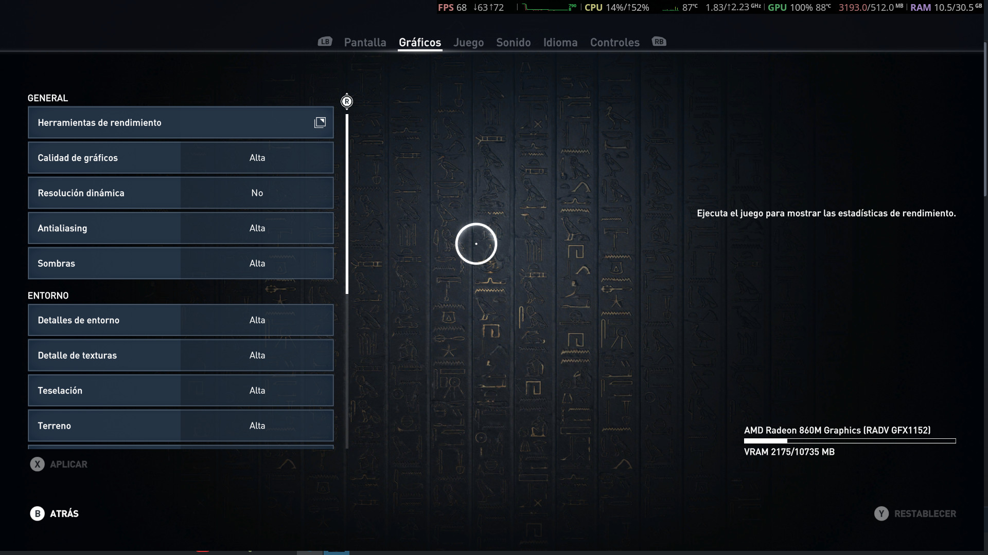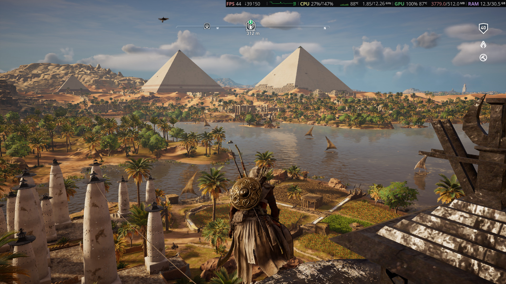 Como se puede ver en la imagen sobre estas líneas, el juego puede ponerse en calidad alta —con algunas opciones desactivadas— y, en apariencia, va sobrado para recorrer Egipto. Pero ¿y durante el juego? Pues también, y con un mínimo de 30 FPS estables en la mayoría de escenarios, aunque para asegurar se le puede retocar un poco las opciones más demandantes, como los sombreados.