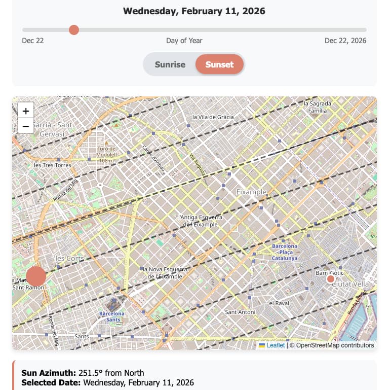 Henge Finder es una curiosa herramienta que sirve para encontrar alineaciones del Sol en las calles de cualquier ciudad. Me fijé en que la calle Alcalá alinea hoy en varios tramos casi perfectamente; en el ejemplo puede verse cómo la Avenida Diagonal de Barcelona queda perfectamente alineada el 11 de febrero del año que viene, dando lugar a una posible «foto perfecta». Se puede elegir entre la hora del atardecer o la del amanecer.