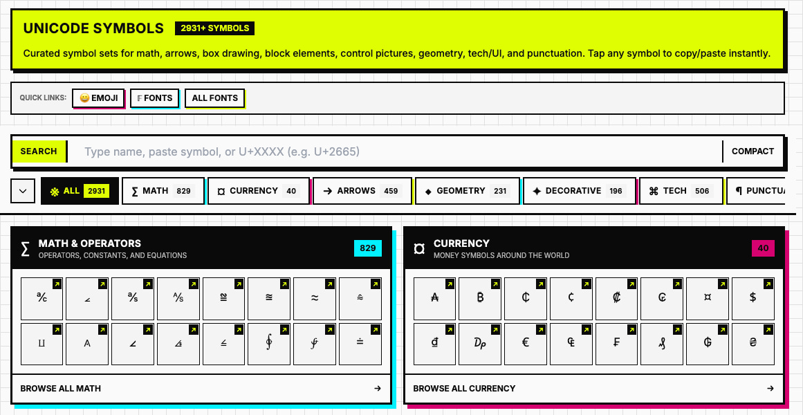 Finalmente, tiene el siempre útil selector de símbolos Unicode, que los agrupa por matemáticas, flechas, decorativos, divisas, geometría… Nuevamente cuestión de copiar y pegar. Hay 2.931 de estos.
