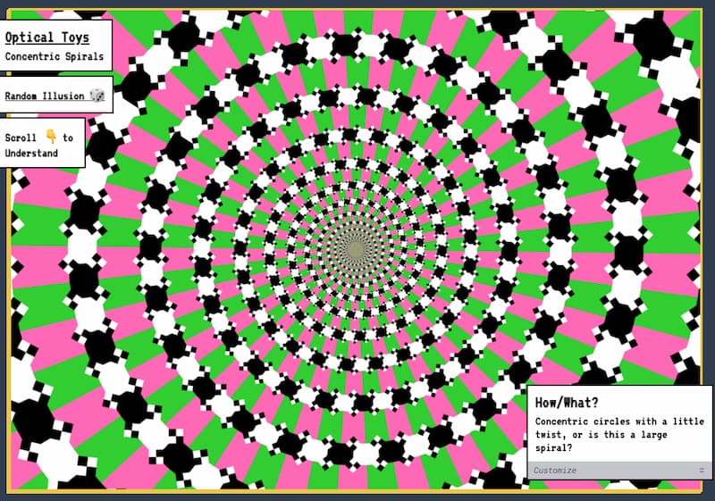 Si te gustan jugar a engañar a tu propio cerebro, echa un vistazo a Optical Toys. Es una galería de 32 ilusiones ópticas, muy bien presentadas y por las que se puede navegar ya sea por orden, ya sea saltando al azar con el botón Random.