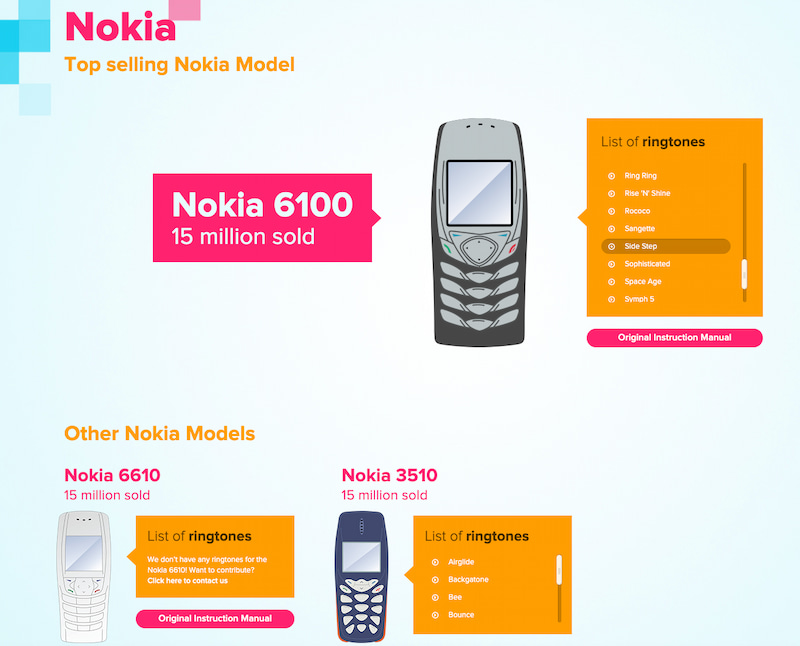 En Explore the History of the Ringtone hay toda una historia de los teléfonos pero, más que eso, de los tonos de llamada que los acompañaban: desde campanas y sonidos mecánicos en el siglo XIX hasta los éxitos pop de la actualidad. Junto a cada modelo puede hacerse clic para escuchar cómo sonaban originalmente. Es todo un viaje al pasado. [Nota: el volumen es un tanto cambiante de unos tonos a otros, así que dale caña. Algunos parece que ya no funcionan o no se han encontrado y no están disponibles, pero la idea en cualquier caso está genial.]