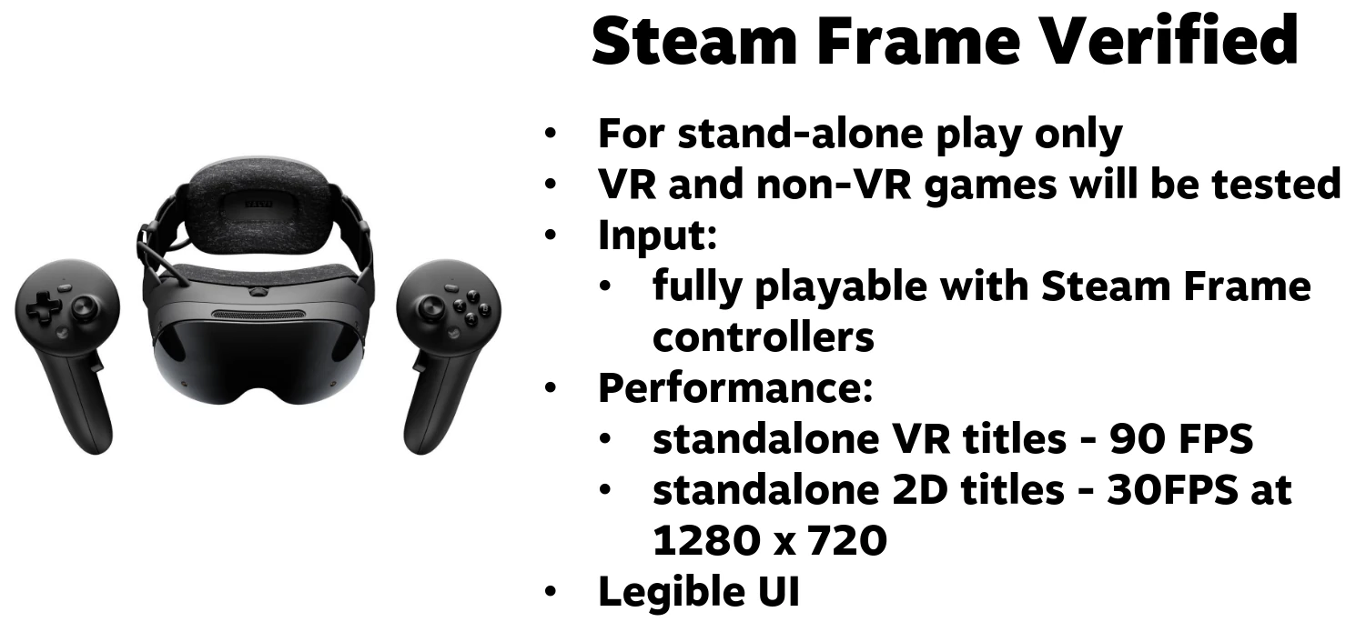 Valve ha publicado también en la misma charla los requisitos de la verificación para el Steam Frame, su próximo dispositivo de realidad virtual. Aquí nos encontramos con que la compañía probará videojuegos tanto dirigidos a la realidad virtual como los que no, que pedirá compatibilidad total con los controles del Steam Frame, comprobará que la interfaz del juego sea legible y pedirá que el rendimiento sea de 90 fotogramas por segundo en videojuegos dirigidos a realidad virtual y de 30fps y una resolución de 1280×720 píxeles (720p) para los títulos en 2D.